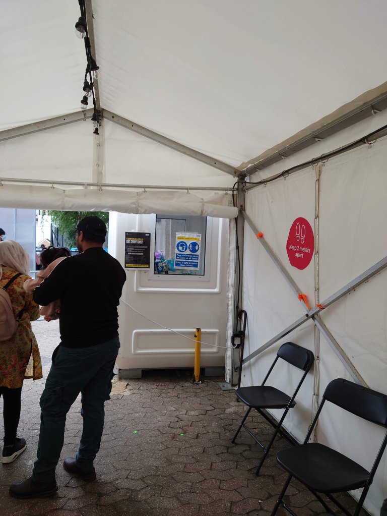I arrived about twenty minutes prior to my appointment – although you are advised to only arrive five minutes before your scheduled time – they still let me in upon checking my details on the email confirmation. Strangely this was then followed by them sticking a coloured dot on you – I didn’t quite realise at the time why this was, however it soon became clear. Green was for the Oxford-AstraZeneca vaccine whilst Orange was for Pfizer-BioNTech. Moderna, the only other MRHA approved vaccine, was not on offer at this site. Currently, only Pfizer-BioNTech and Moderna are approved for under-40s and thus accurate identification of people taking different vaccines need to be made. I then proceeded onwards to the actual building to get the vaccine.