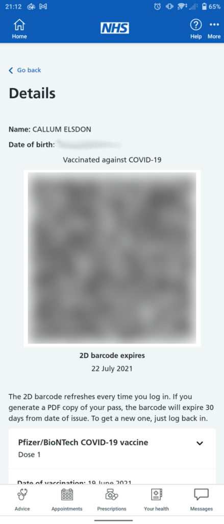 I then went past the first floor offering the AstraZeneca vaccine and onto the, far busier, second floor offering Pfizer. Once in, I was advised for the third time to show my appointment details (at least security is tight!), had my orange sticker removed and was taken to a desk to share my personal details as well as NHS number. After handing this over, I was very quickly taken to another booth to get my vaccine injected and it was all over within two minutes…such an anti-climax…however to make up for the loss of the green sticker they give you a “I’ve had my Covid Vaccination” one instead to tell everybody around you that you’ve had it. Quickly you will then be ushered to a socially distanced seating area to sit for fifteen minutes to check there are no abnormal reactions before you can then be released back into the world. For the next 36 hours or so, I did experience a sore arm however it was not limiting and I felt quite normal for the intervening period. Within a day of getting the vaccine, my first dose already appeared on the NHS app allowing me to prove that I had taken it – which will come in handy in the future for travel abroad.