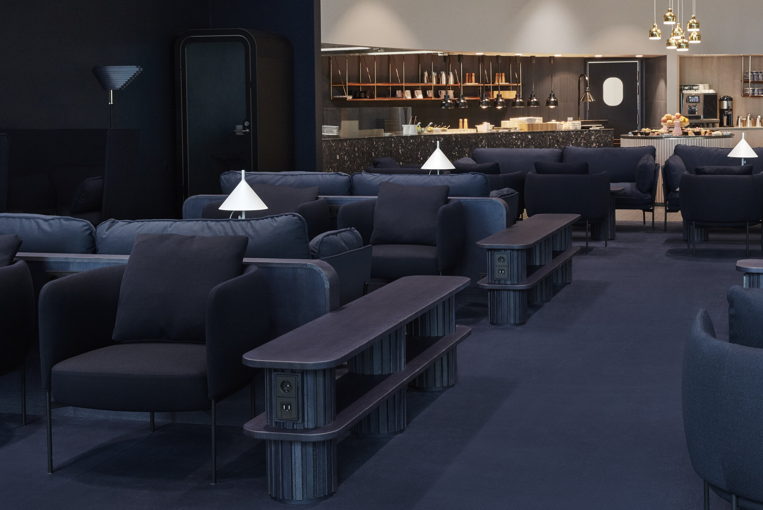 • varied seating include low sofas, single chairs, high bar stools and office-esque desk chairs.