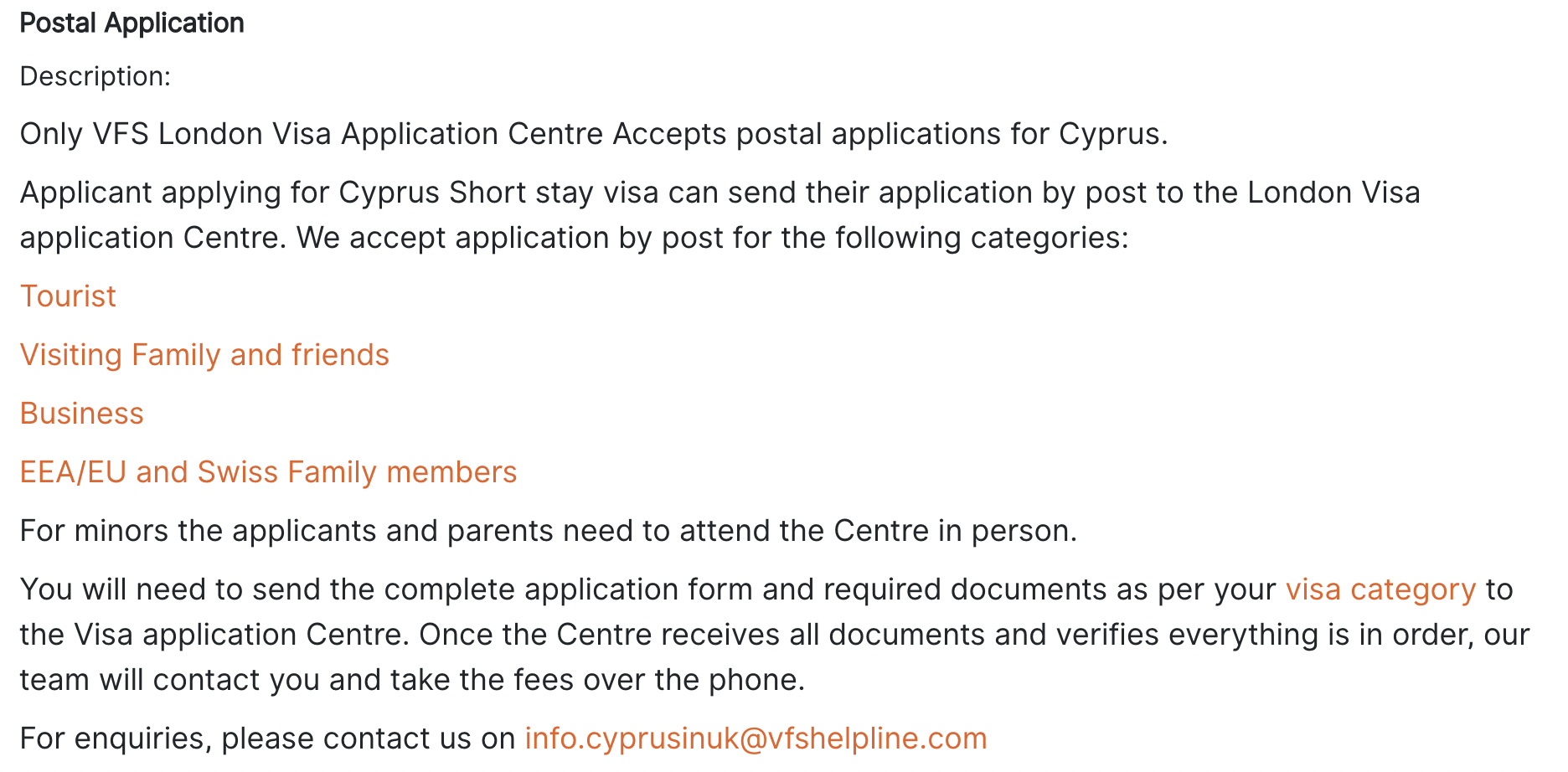 Applying for a Cyprus visa wasn’t straight forward. Like most visa applications, even during Covid-19, in-person appointments are still preferred to confirm identity and process the visa. To add to difficulties, there was no visa appointments available for a month and when there was availability it seemed to only have 2 appointments available on those days. But, the Cypriot Embassy have allowed visitors to the island to submit visa applications via post since February to the London office. The application administration is processed by VFS Global, who appear to have a near-monopoly on this industry having experienced them for Denmark, India, Russia as well as Cyprus. My difficulty in this was how little information is actually on their website for submitting by post – the below is the extent of information they provide, which is pretty ridiculous, with the link simply going to a schedule of optional services.