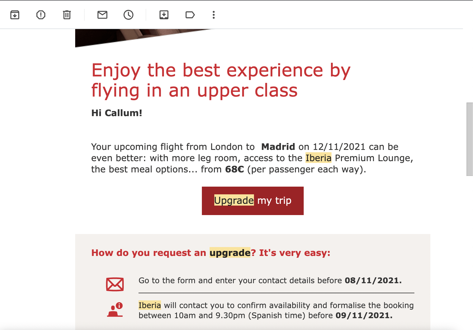 The final option is one that is only going to happen by luck and the route you are flying – and this is how I got upgraded on my London to Madrid flight. Seven days prior to my journey, I received a slightly conspicuous email from Iberia which I thought could be spam – although it did feature my Iberia Plus number which made me think it was genuine.