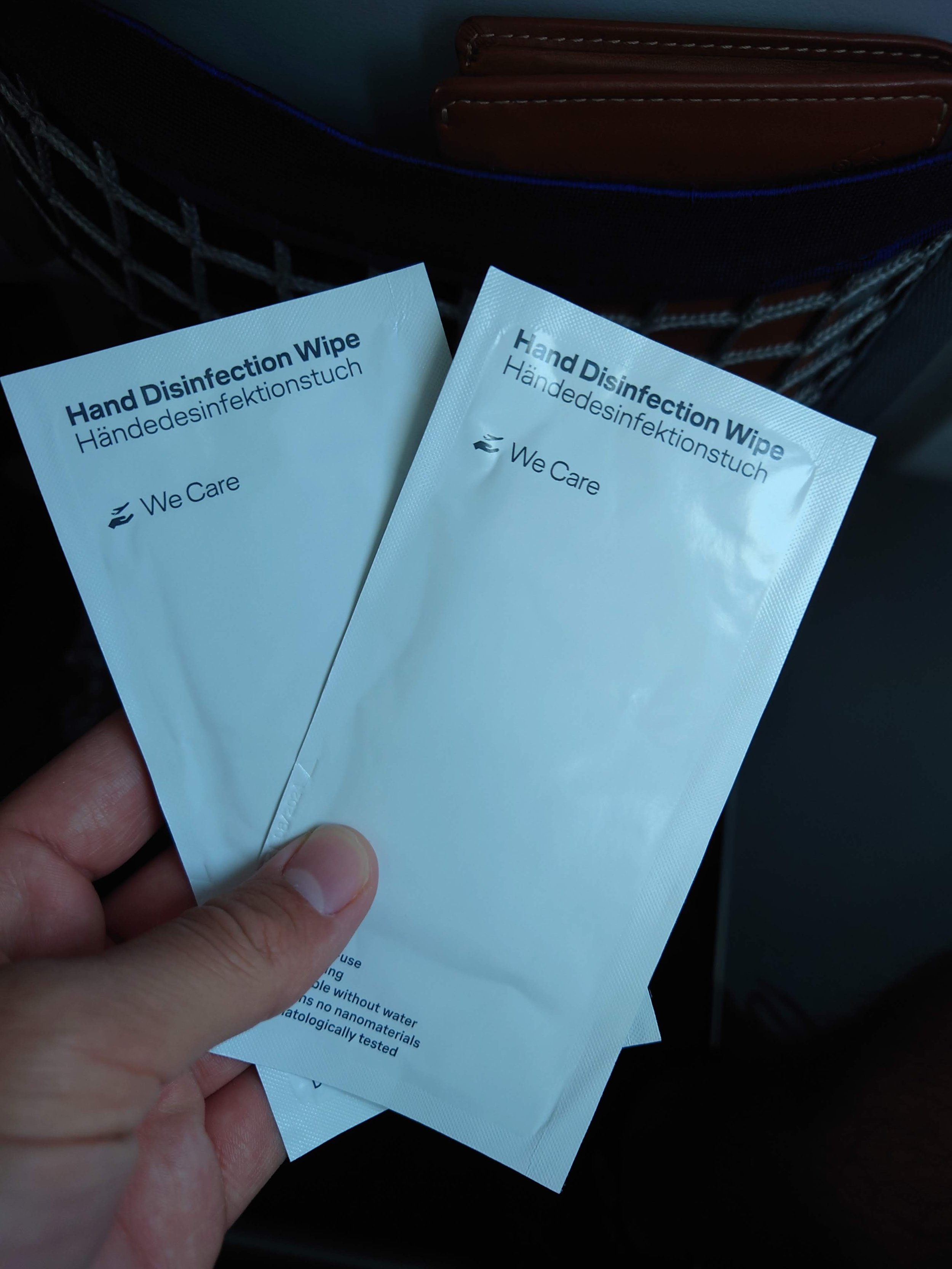 Free alcoholic-wipes are provided to passengers to clean their seat area. I suspect that this will be axed to cut costs as soon as Lufthansa can get away with it.