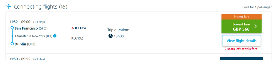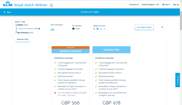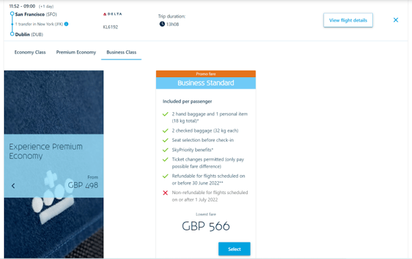 Go a bit deeper into flight details and you’ll notice that it’s not quite accurate. Even though the international sector from New York-JFK to Dublin was in Business Class, the San Francisco to New York-JFK sector was in Economy Class – despite being advertised as a Business fare.