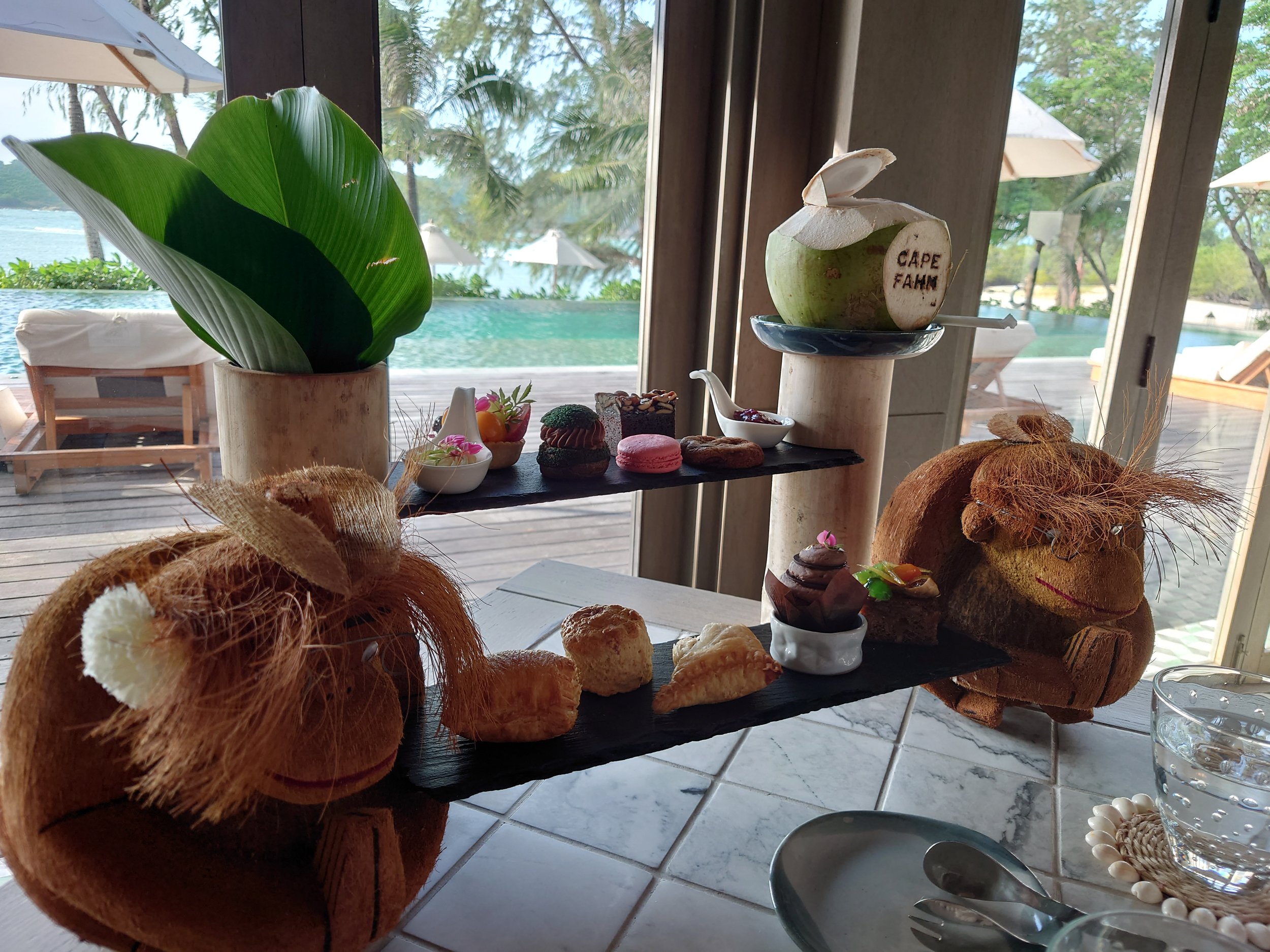 Our first experience of food at Cape Fahn was Afternoon Tea at the Hue restaurant on-site. This is the restaurant and bar situated next to the pool and beach. It was beautifully made with a selection of cakes and desserts – but it was just a bit of a sugar rush considering we also had a big chocolate cake in the room as a welcome from the hotel. The afternoon tea was served on natural materials and was sat between two quirky monkey characters carved into coconut rusks that would have otherwise been thrown away. Further burnishing their eco credentials was the young coconut-niyog served which Lloyd loved – and took him back to his childhood in The Philippines. I’m less of a fan of coconut water but maybe that’s just because I’m no used to it