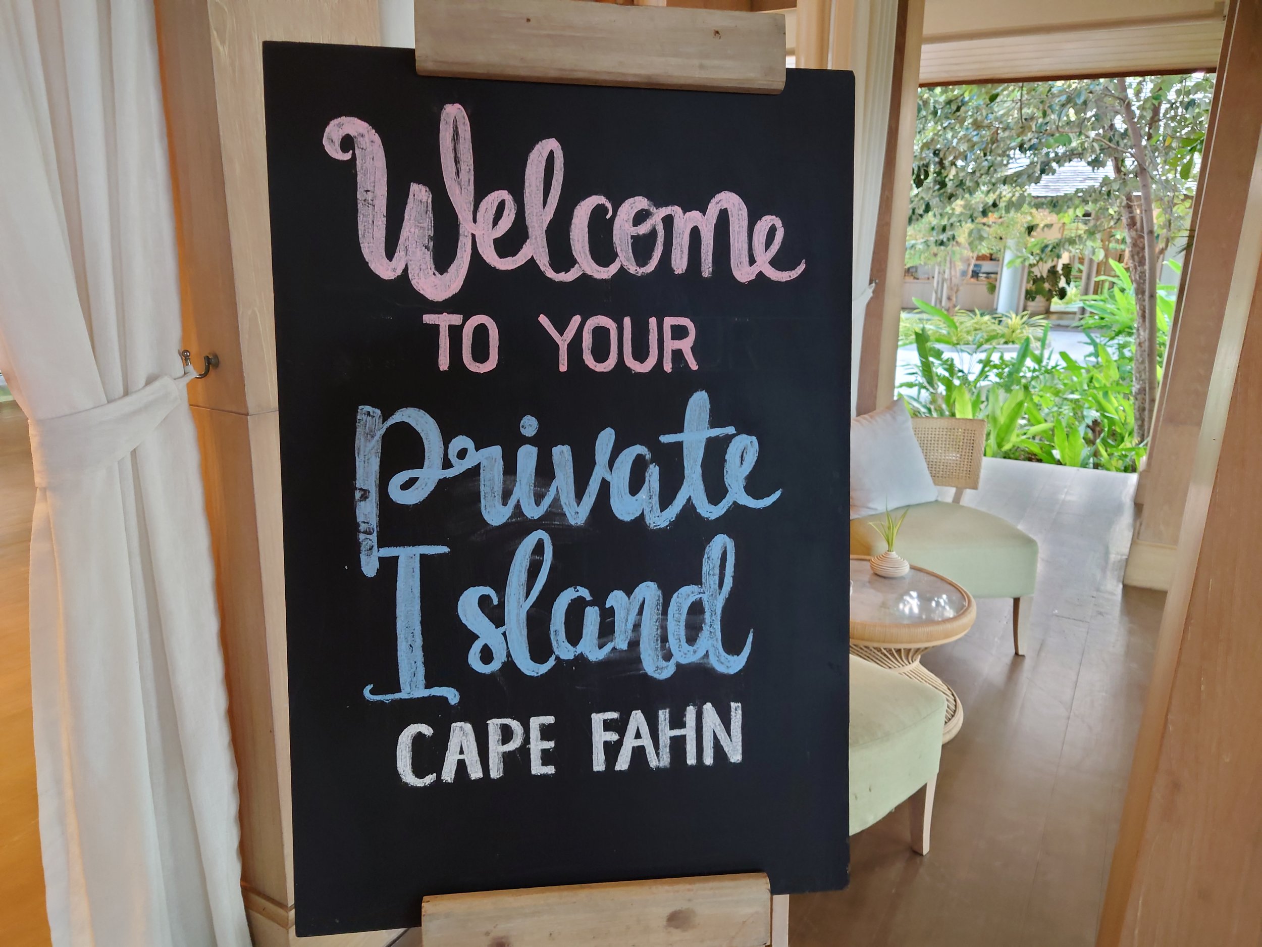 We were greeted by the excellent reception staff who guided us across to the open air reception which is clad in light coloured wood and utilises a lot of natural materials. Throughout the Cape Fahn property emphasis is placed on being environmentally friendly whether that is via the use of reusable water bottles, no single use plastics or electric vehicles (golf buggies) around the island. This was even shown through the Christmas tree which appeared to be created from discarded plastics.