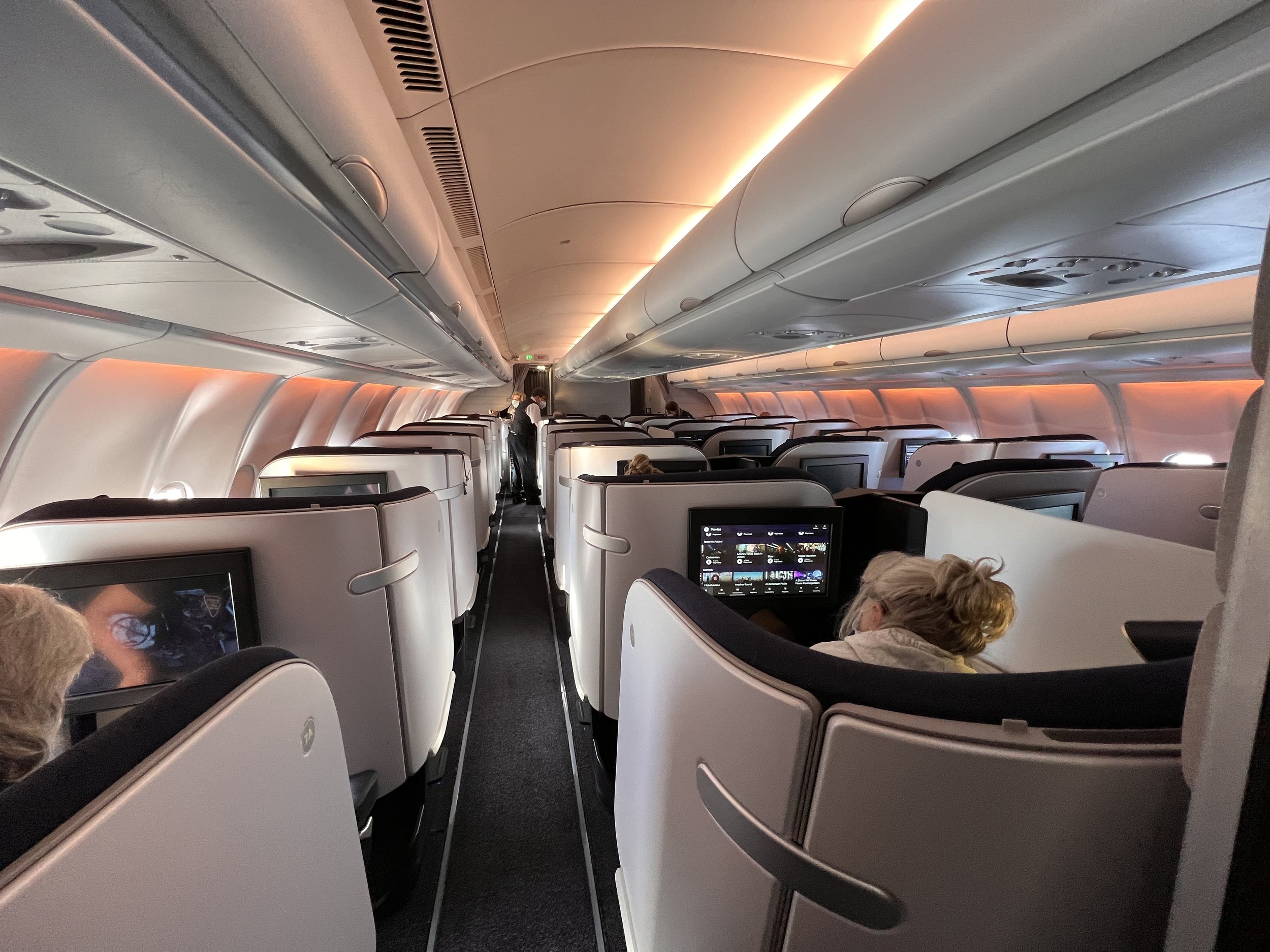 Together this creates a lengthy space to stretch out in and get some rest. Some observations from the couple of minutes I spent laying down is that the footwell is no less constrained than that of other reverse herringbone seats such as the new-ish British Airways Club Suite. I could lift my feet from side to side or up and down with ease but I could see how some people could find it a little constrained – particularly if you have large feet.