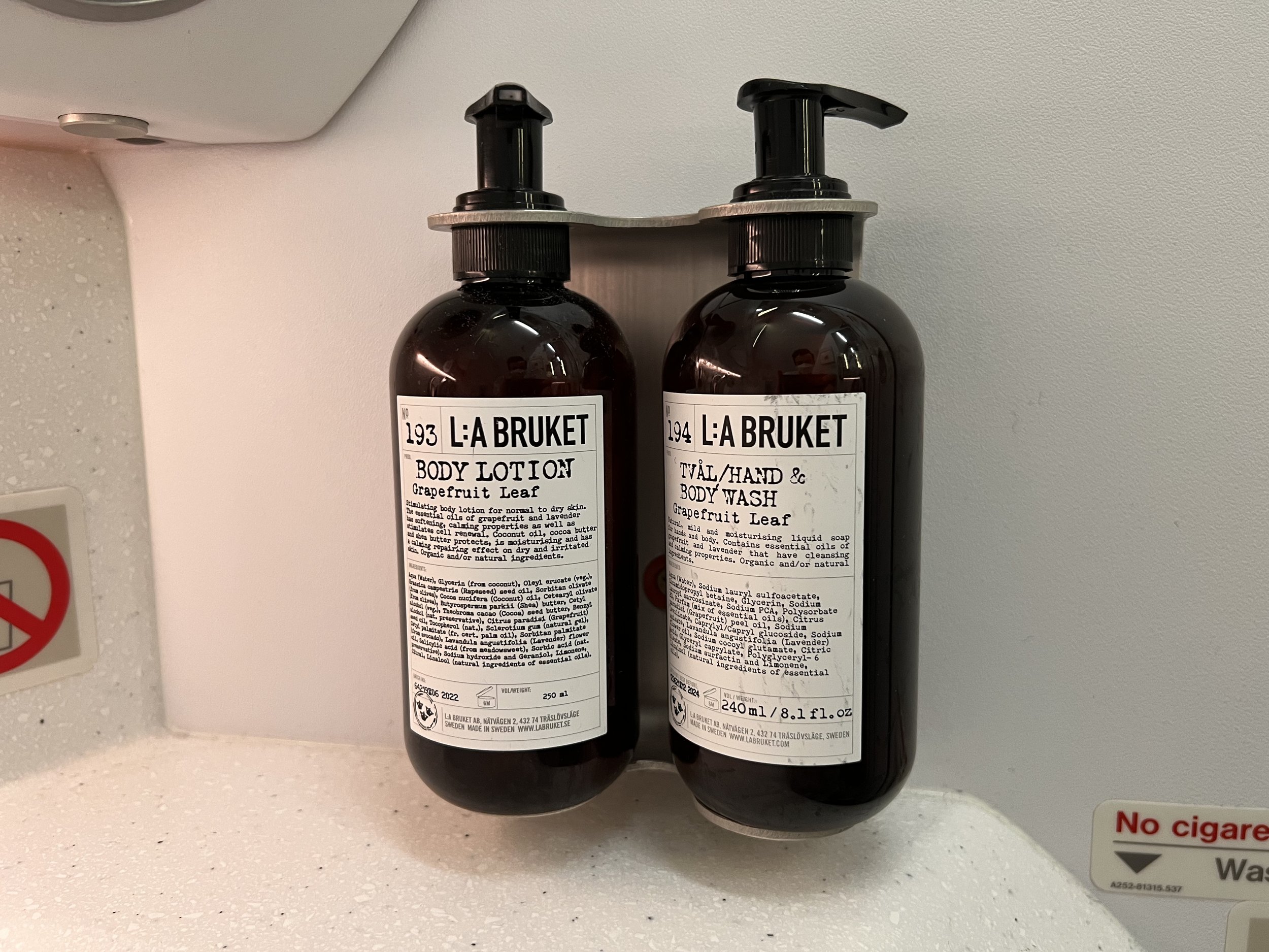 Like the lounge, the soap and moisturiser amenities in the toilets are provided by Swedish company La Bruket. Again, these are of excellent quality and smell gorgeous.
