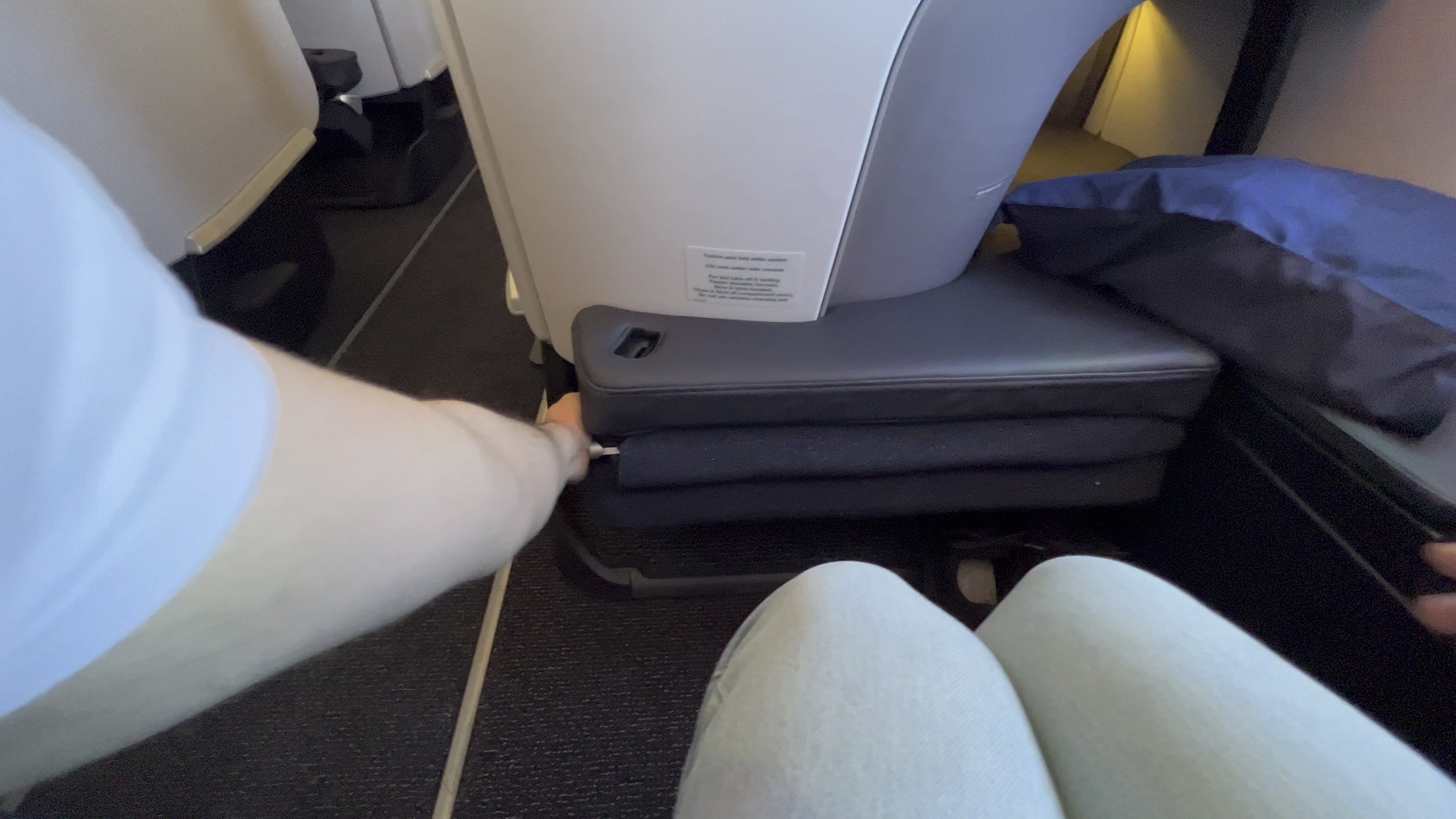 Although the flight is pretty short, I did get a chance to get into sleeping mode on the seat. The easiest way to get the seat set up is to stand up first then pull the lever on the furthest leg rest in the downward position.