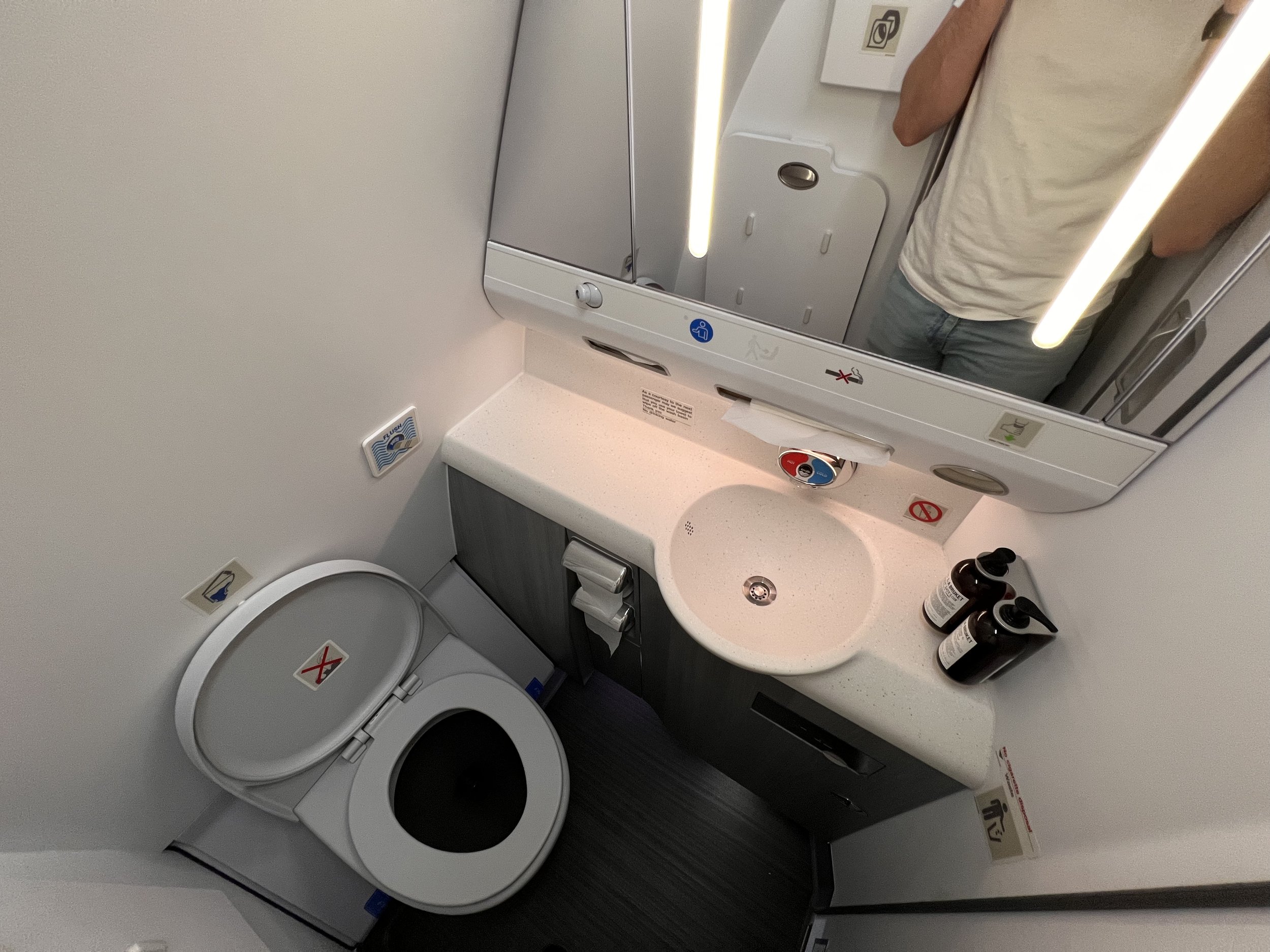 There were three dedicated Business Class cabin toilets on this flight and they appear to have received a minor uplift too. The toilets have been clad in a cool wood effect floor and surroundings alongside excellent lighting integrated into the mirror. Upon visiting two of the bathrooms, the cabin crew managed to keep them extensively clean and tidy which isn’t always a given on European airlines.