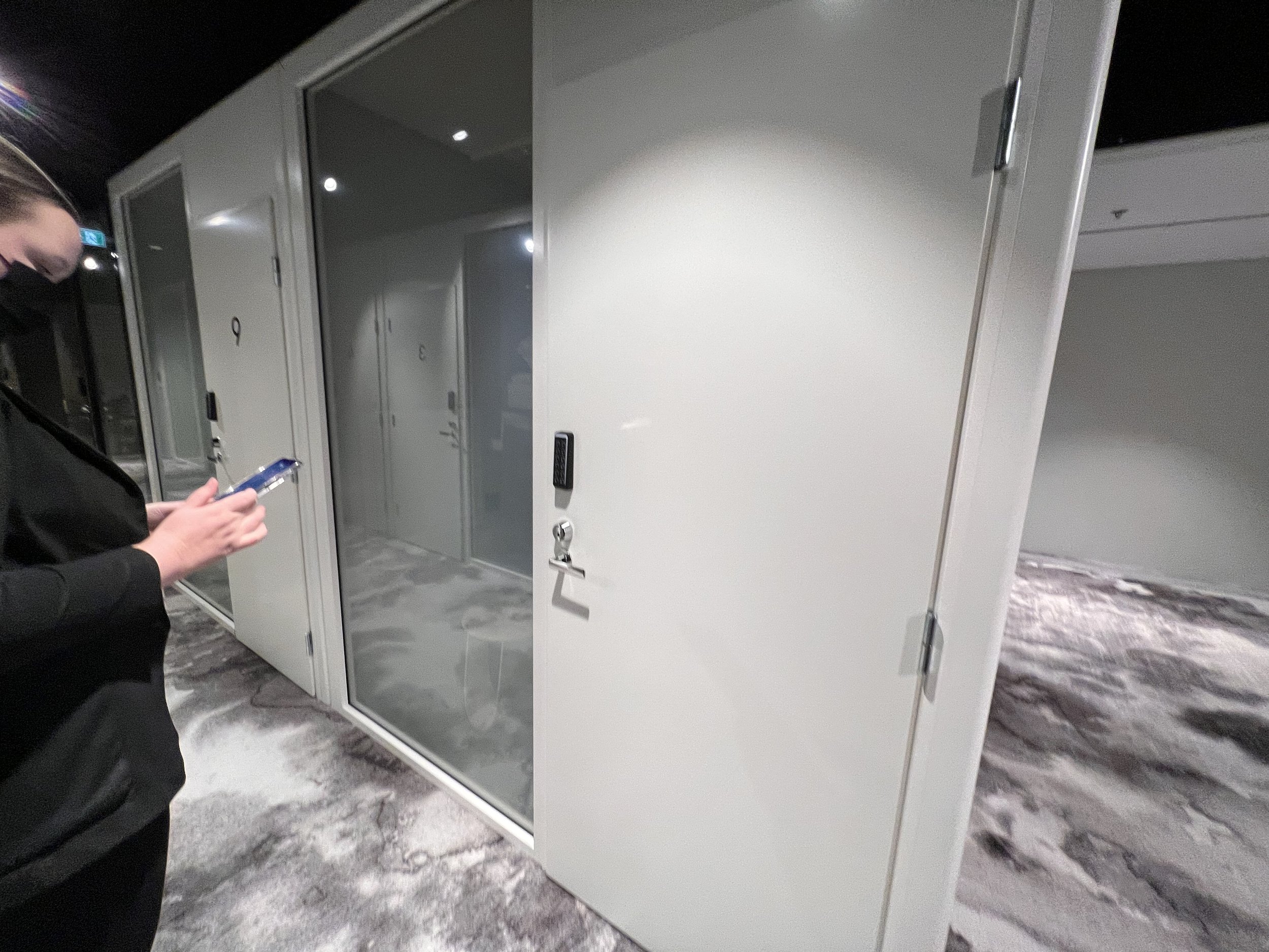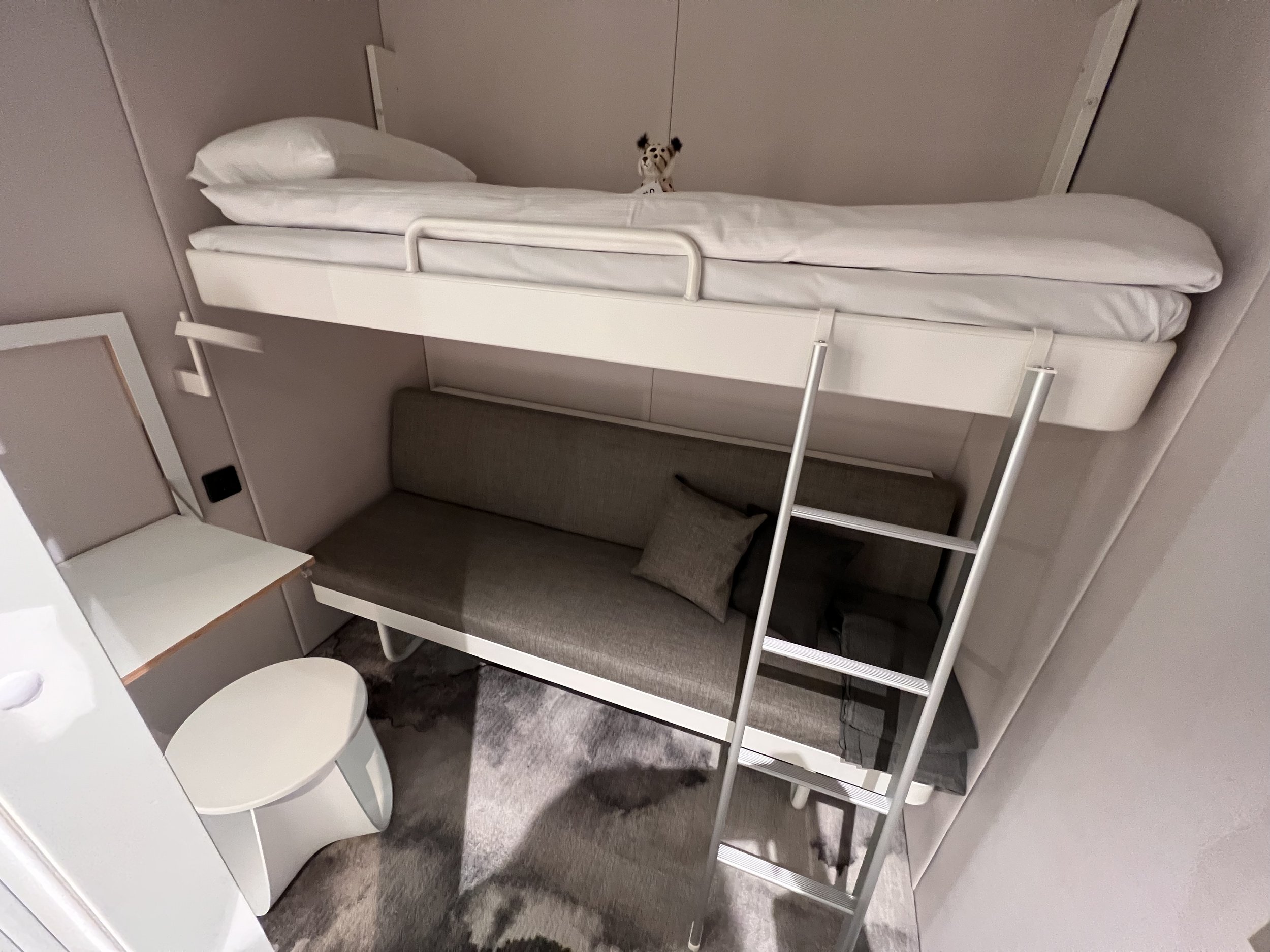 Regular Rest Pods are designed for one person sleeping or two people relaxing/working. The total space of the room is 3.6m squared which is not particularly spacious, but enough for a short visit. The sofa turns into a 2 metre long bed with sheets provided as well as a sturdy table that flips down from the wall. Power is provided in the form of a European power outlet, USB and USB-C port.