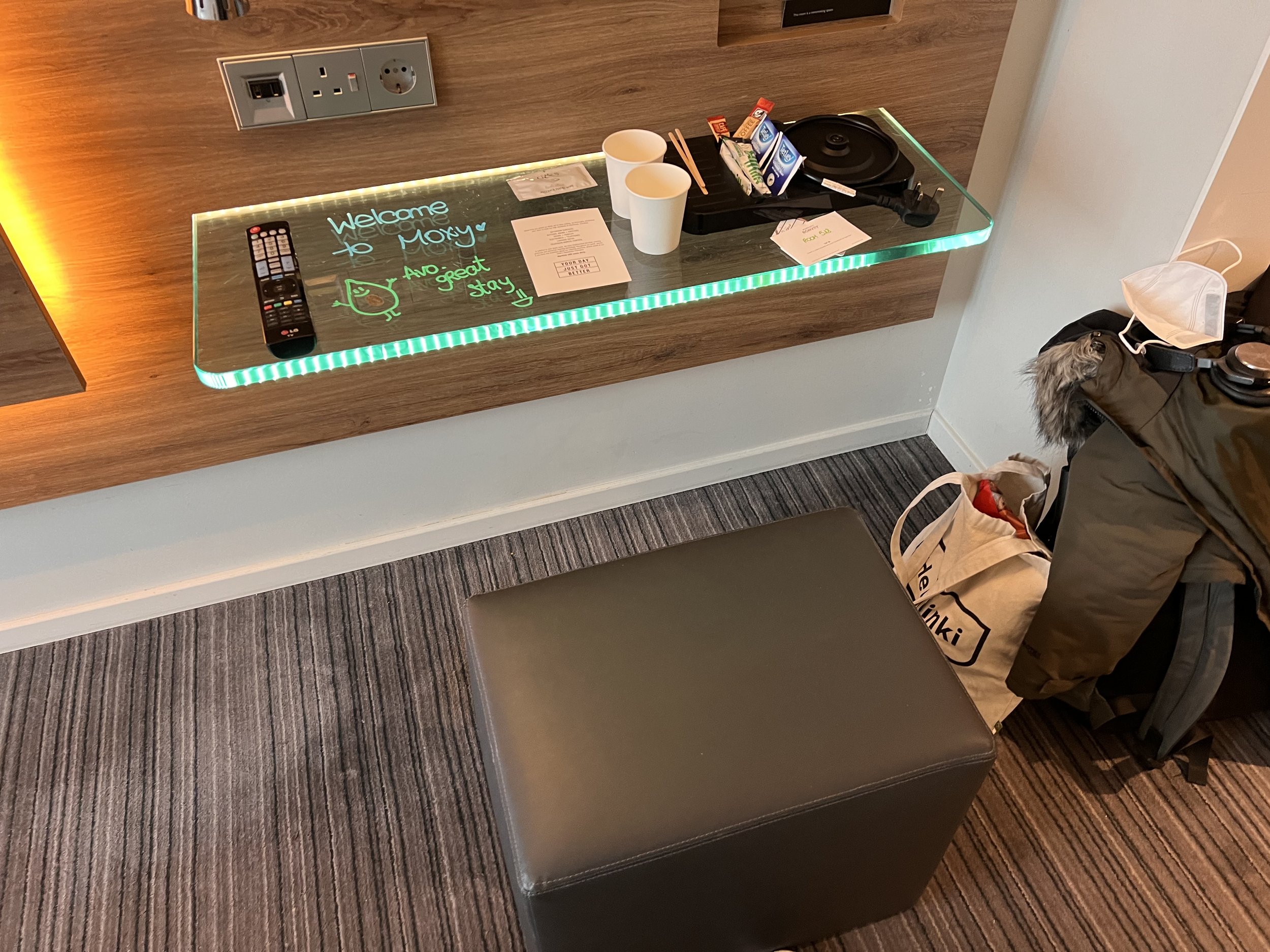 The ‘desk’ (if it can be called that) constitutes a small pane of glass which is by no means big enough to hold a laptop – you are most definitely better off going to the lobby to work.