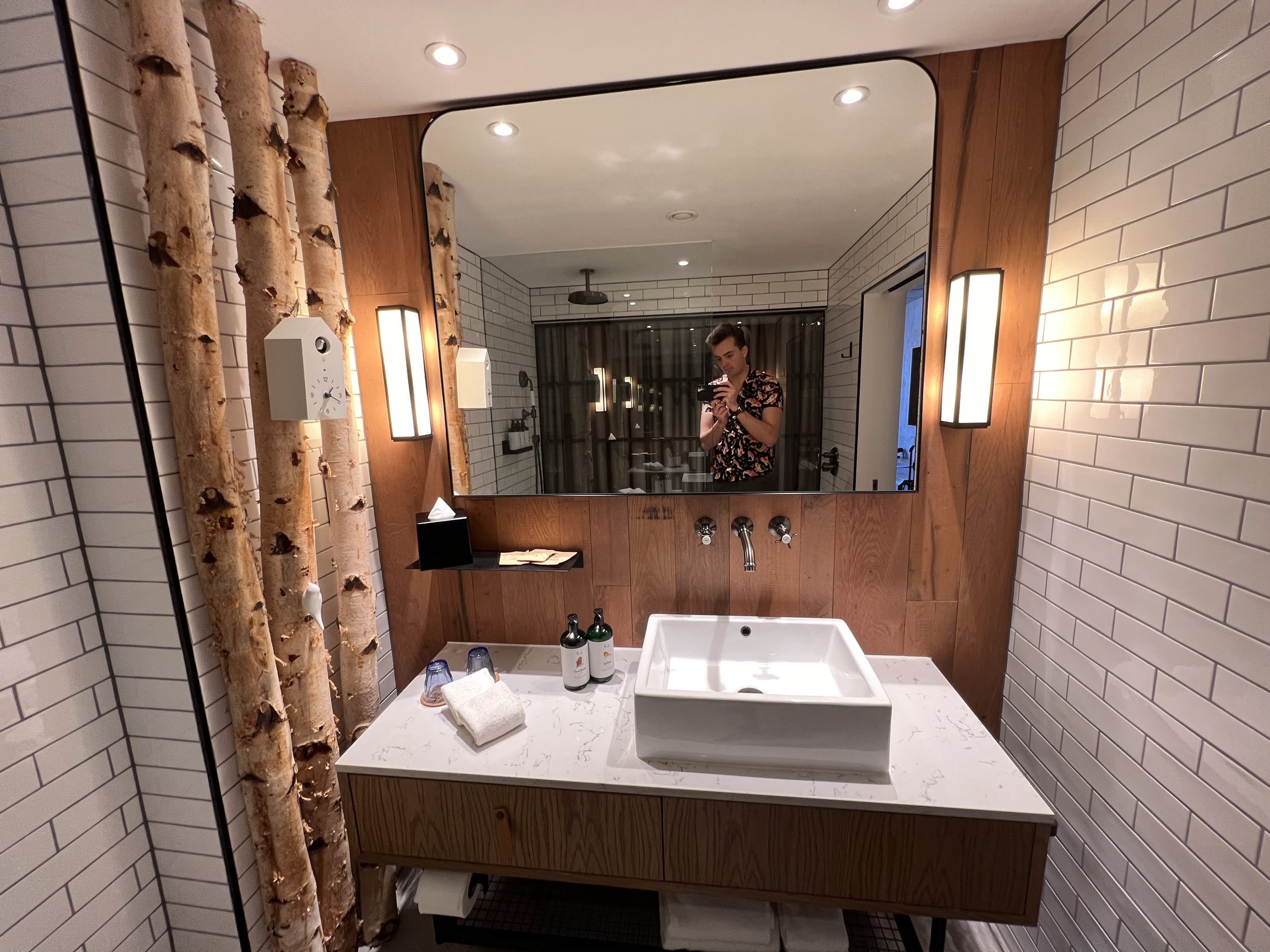 A large bathroom is found in the room as you would expect at this price range. On one side, there is a huge mirror as well as a singular washbasin below this. In here, you can see the signature wooden look to reflect the natural treehouse look the hotel is going for while maintaining a modern look alongside the white tiles.