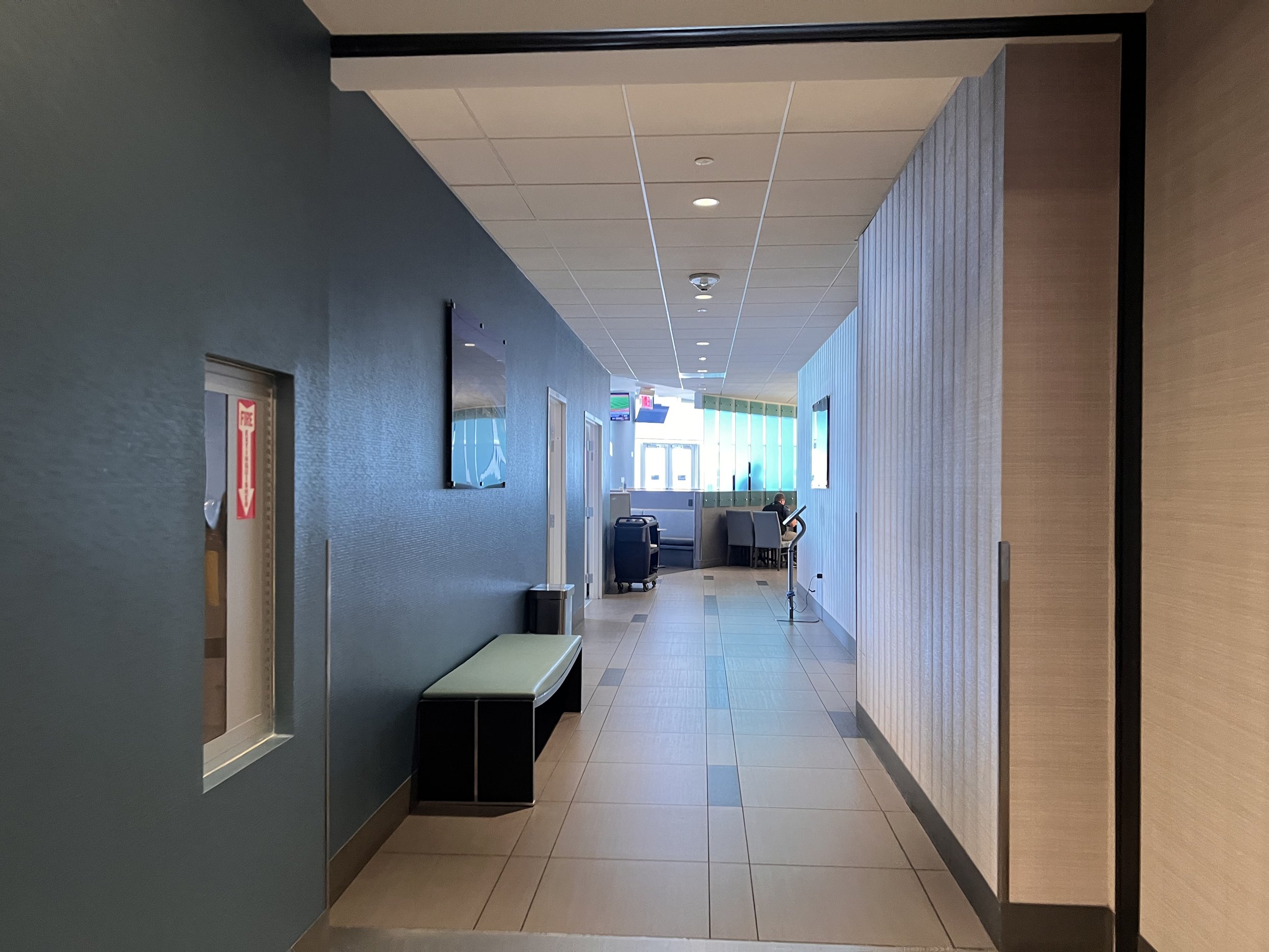 The lounge area is laid out in a concave design that provides excellent runway views if at the window. However, the booth furniture style deployed both makes the space feel cramped while providing little privacy for visiting guests.