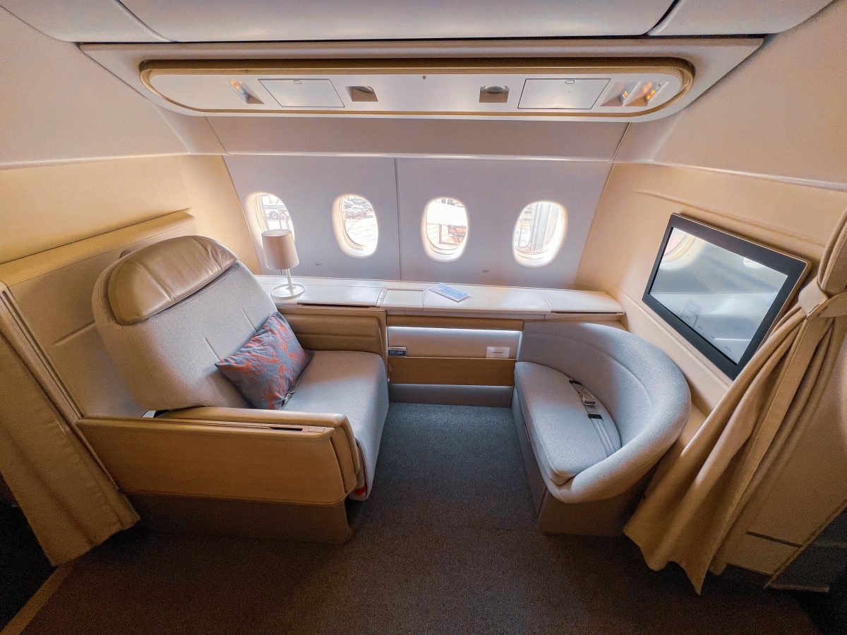 The cabin is intimate with four seats across in a 1-2-1 configuration. Each seat consists of an extremely comfortable armchair measuring almost 90cm wide and an ottoman opposite. An adjustable headrest is also featured while the seat does also recline into a multitude of positions including bed mode.