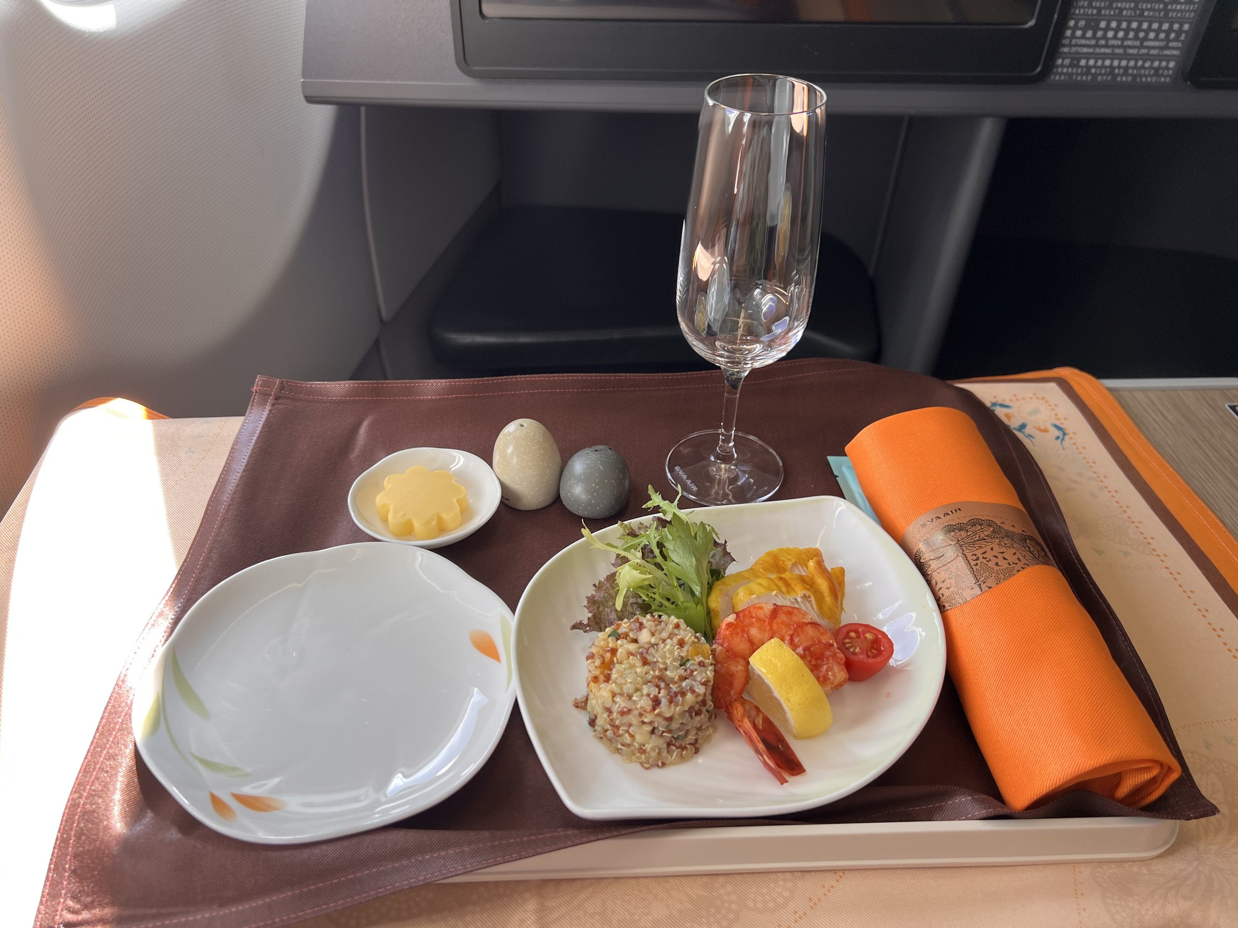 Where EVA began to shine in their service quality was the three course meal service on this flight. For the starter, we were served a few slices of chicken breast with a solitary prawn, a rice dish and lettuce leaves alongside a tasty piece of garlic bread. While the combination was a little odd to me, the taste was excellent and a light start to the meal.