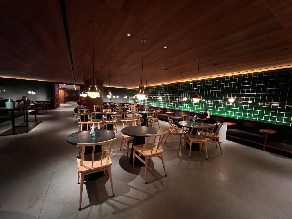 The famous Cathay noodle and dim sum bar makes an appearance in the next section of the lounge with a similar selection to the First lounge at Heathrow. Sufficient dining spaces for individuals and groups are available with a decor that is inspired by noodle bars in the airline’s home city.