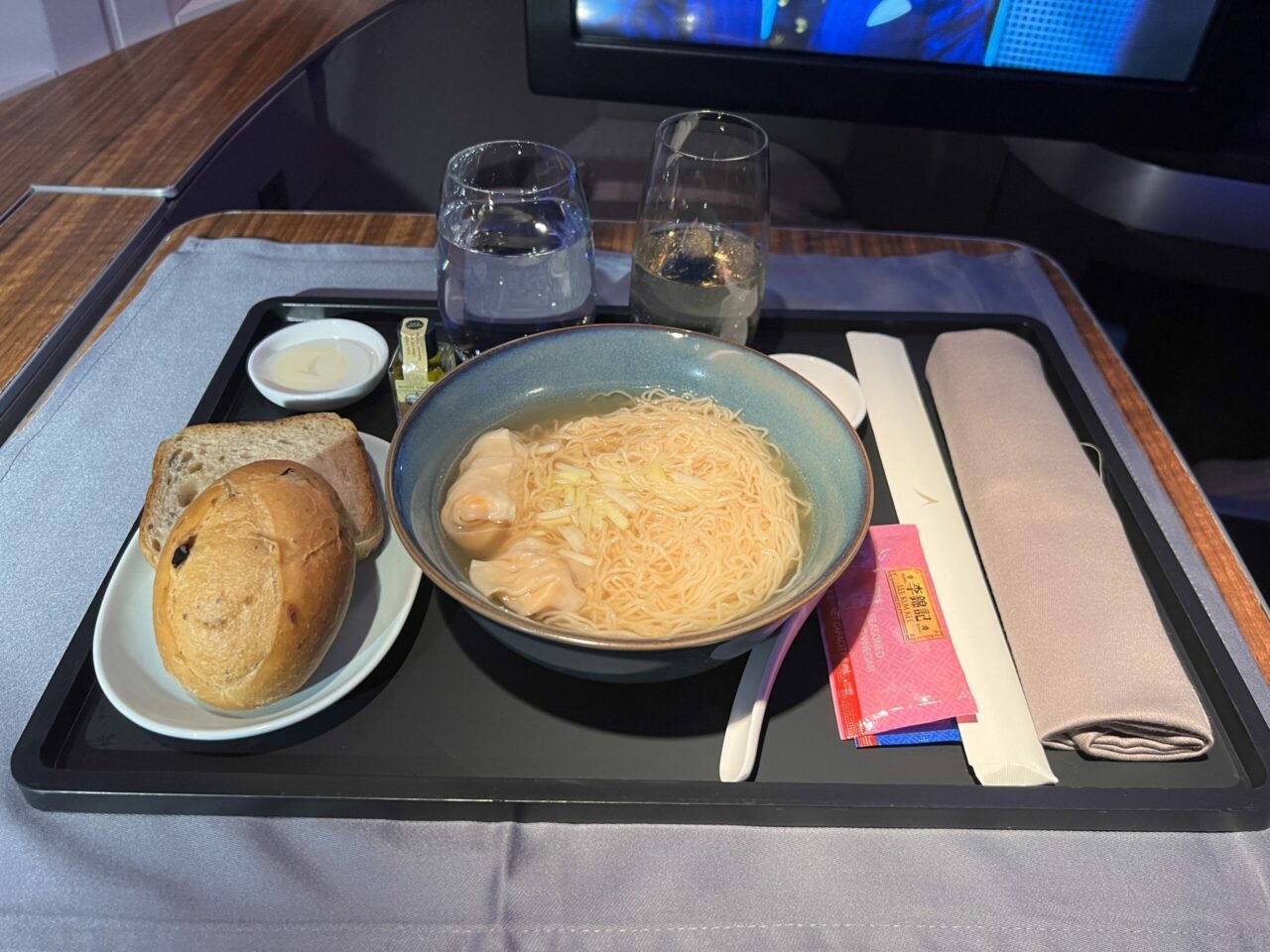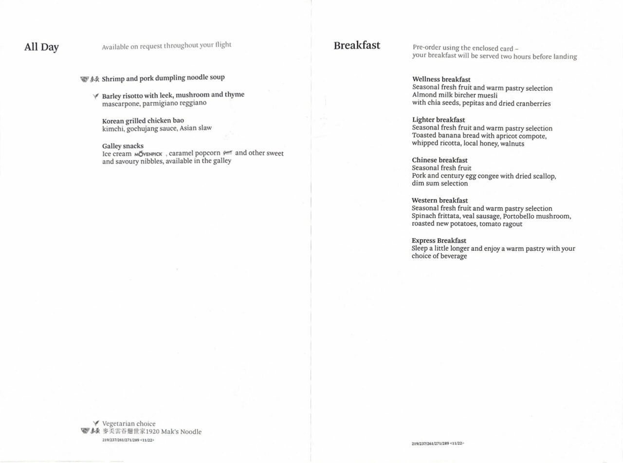 I opted for the hearty shrimp and pork dumpling noodle soup which may be a very simple dish but was all I wanted on a flight at this time. Like the noodles at the Chase Sapphire Lounge, it could do with extra dumplings but otherwise it was tasty and full of flavour. If I were flying Cathay Pacific again, I probably would not opt for them as my supper simply because you can also choose them from the All Day snack menu.