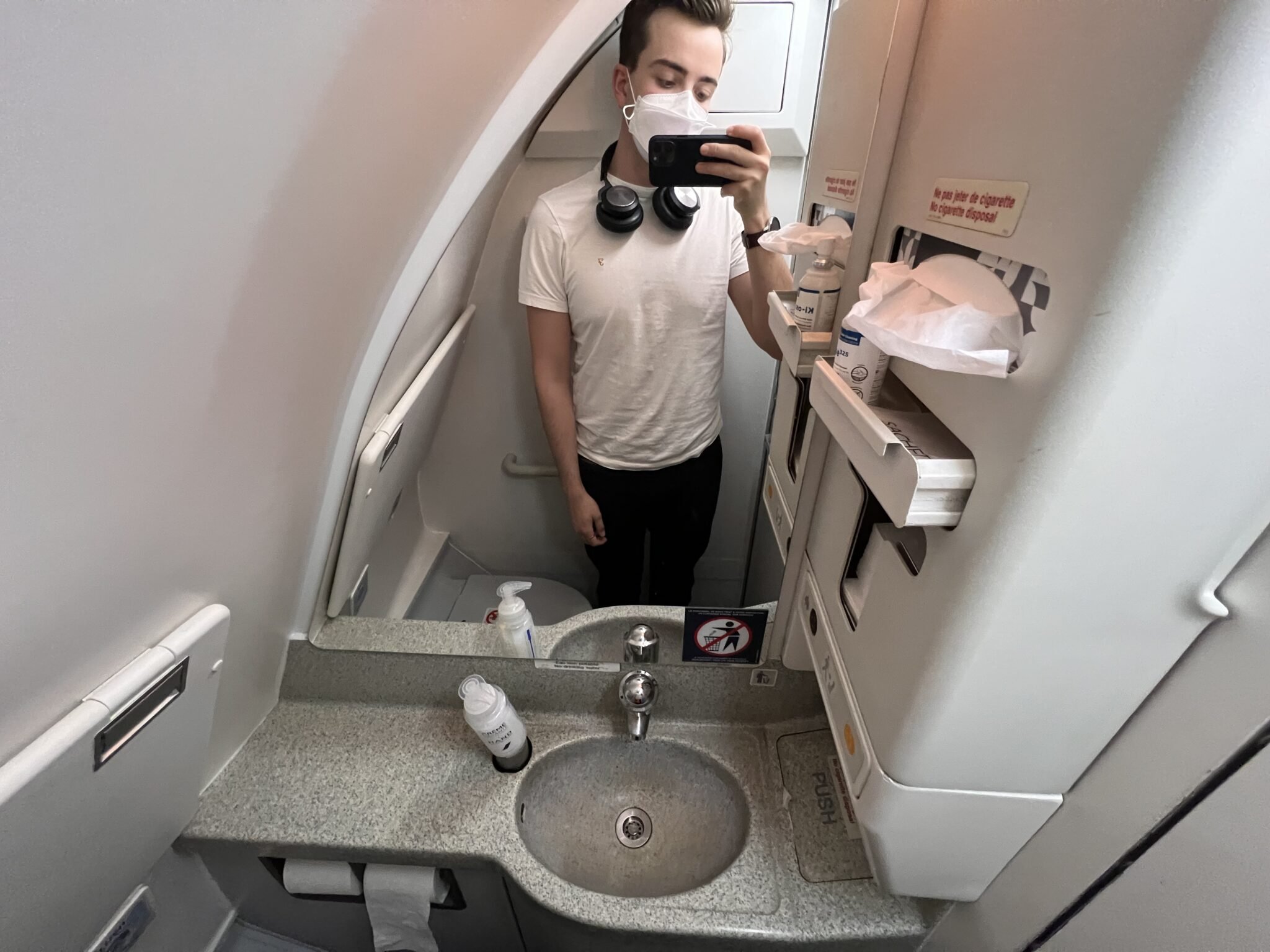 There was time for a quick look at the bathroom which consisted of the usual expectation from a narrowbody aircraft. No special amenities like British Airways’ The White Company soap and moisturiser are provided in the Business Class cabin.