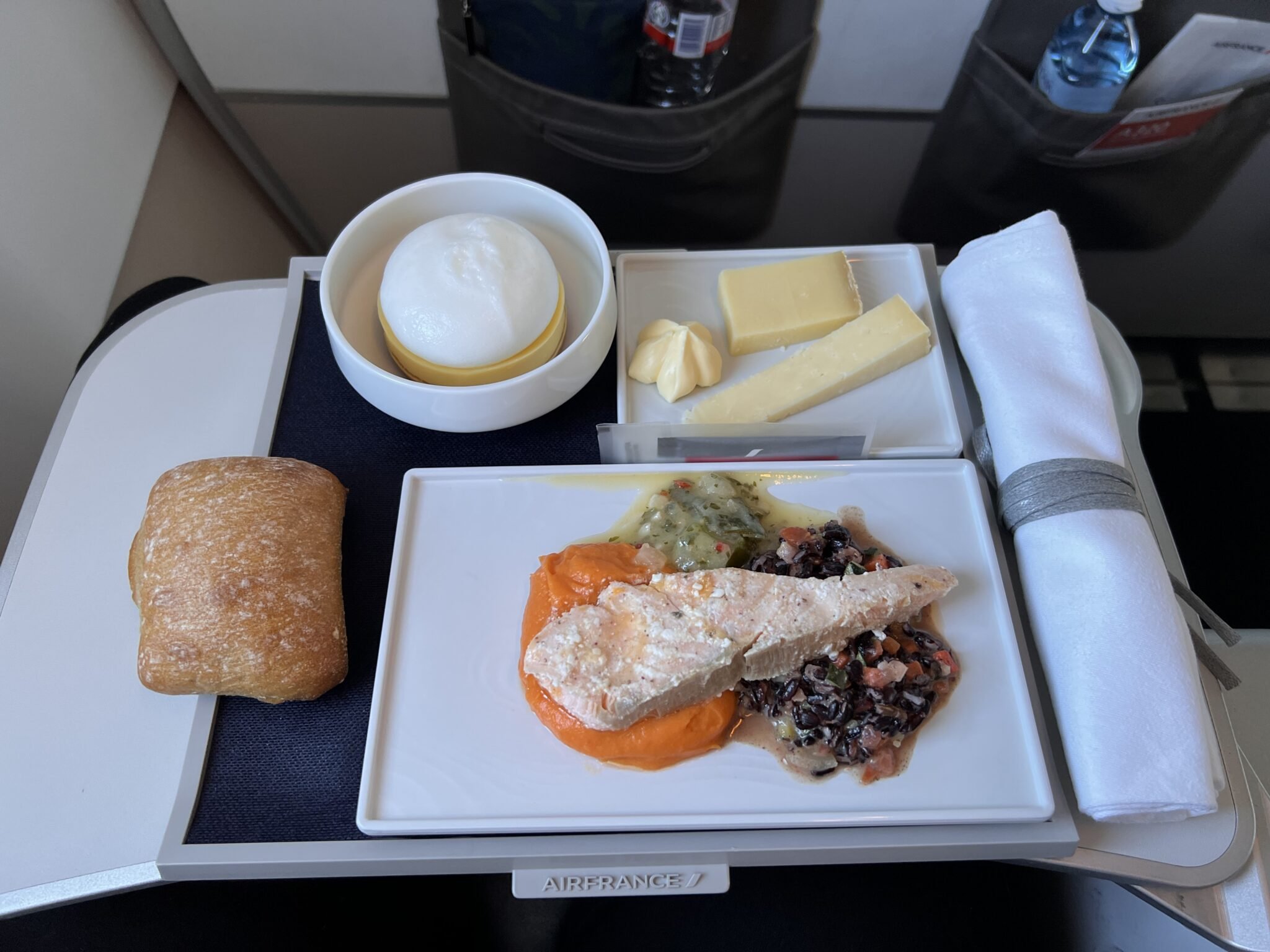 A tray of cold dishes was served on this flight to Paris. This consisted of a Salmon on a bed of a cold sweet potato dish and a bean salad which had a fresh taste and tasted surprisingly well. The roll was excellent and not soggy as it is on some other airlines. Meanwhile, the cheeses served had lovely nutty and medium tastes respectively, although I would have welcomed a soft brie cheese alongside the two hard cheeses. The dessert was featured a strong lemon flavoured foam atop a lemon cheesecake providing a sour and refreshing way to finish the light meal.