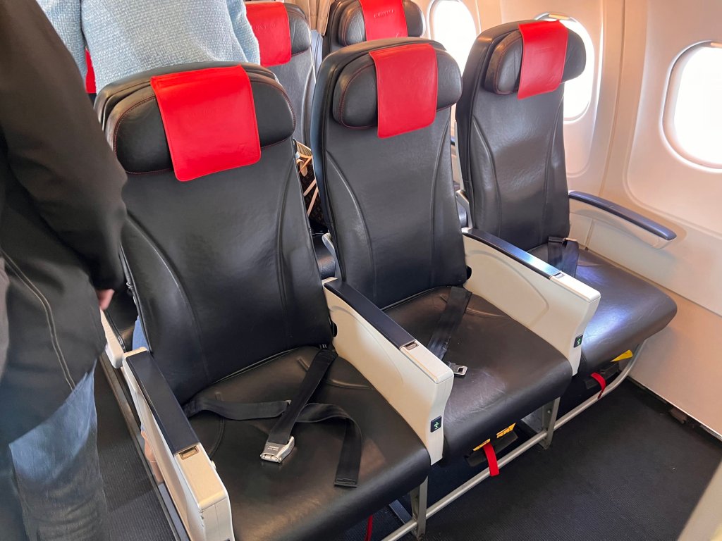 For this flight I sat in seat 1A. The 3-3 layout with an empty middle seat and adjustable curtain will be familiar to frequent British Airways Club Europe passengers. The Business Class cabin differentiates from Economy by the red leather headrest covers compared to the slightly funkier looking headrest cover in the rear of the plane. Unlike some British Airways aircraft, there was not a table that could be deployed in the middle seat for extra space.