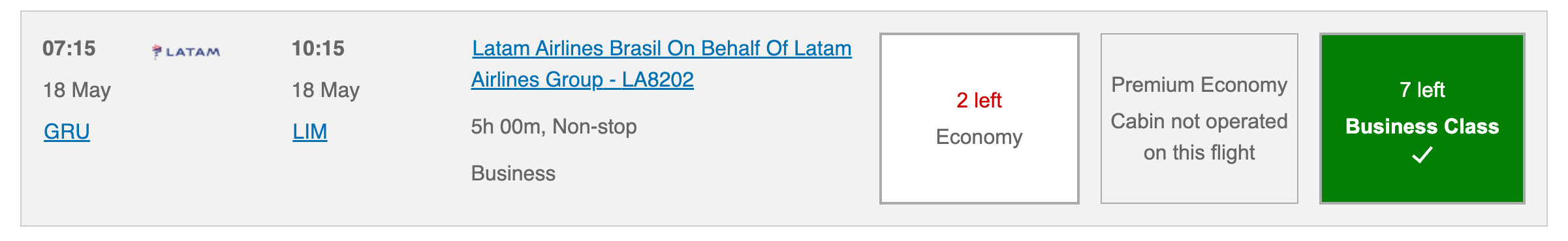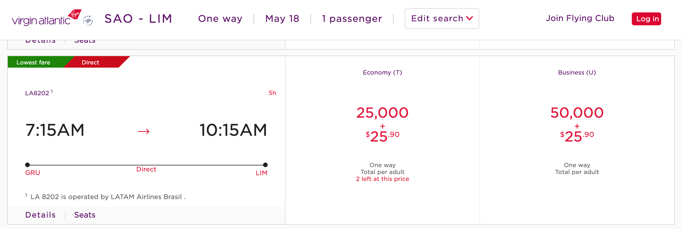 Surprisingly, Virgin Atlantic have integrated their systems with LATAM – meaning you can search for award availability directly on the website, rather than phoning up. British Airways can also bring up availability online and the space available on both websites will generally be the same. The surprise comes from Virgin traditionally having bad integration with partners with most only being bookable over the phone.