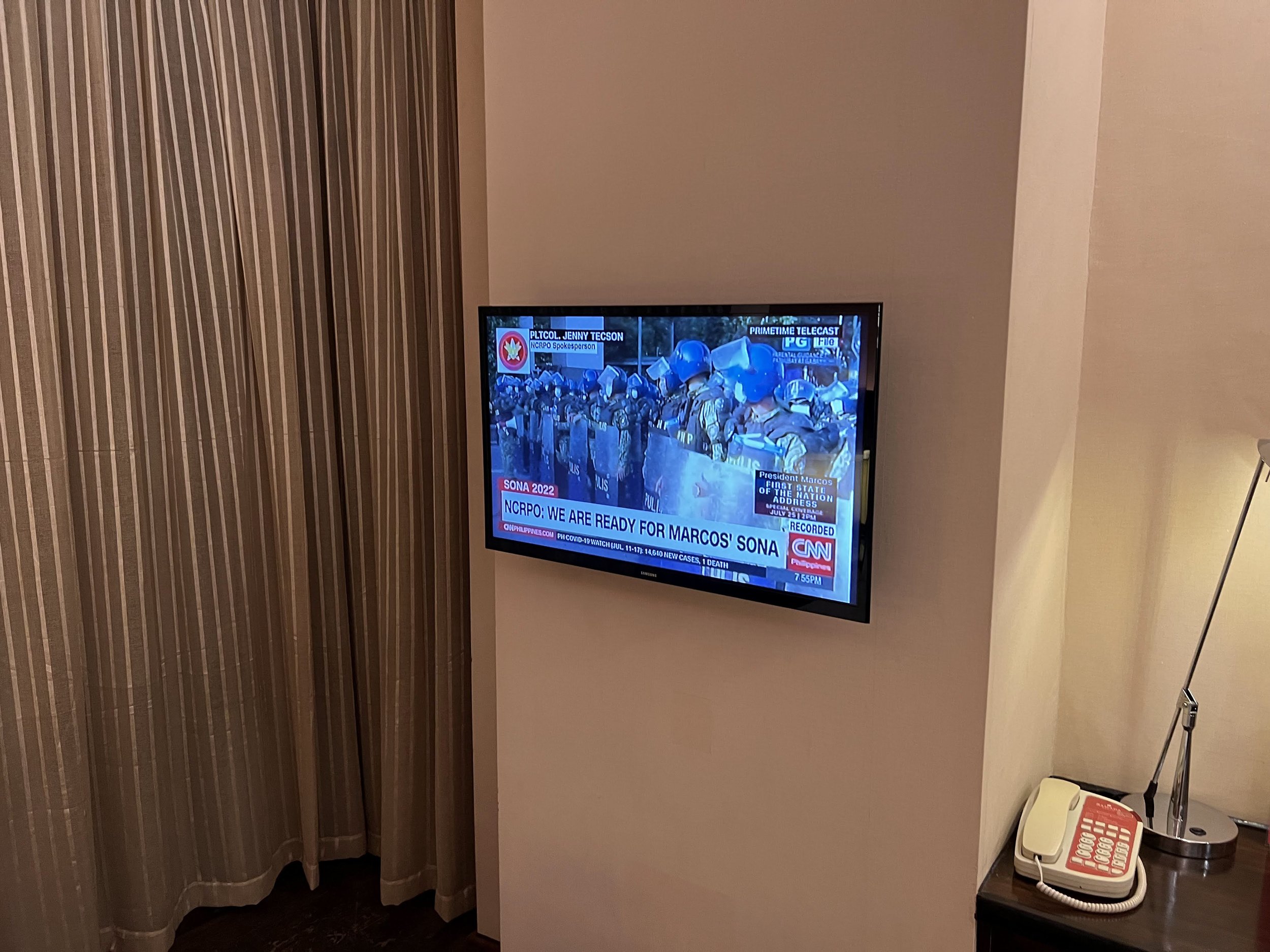 Two sets of curtains are placed at the window – the semi-opaque version for privacy and one behind to darken the room. The view from my room looked over Binondo and a church in the immediate vicinity.