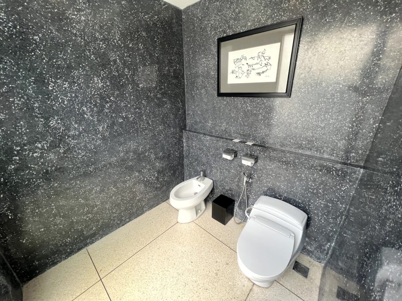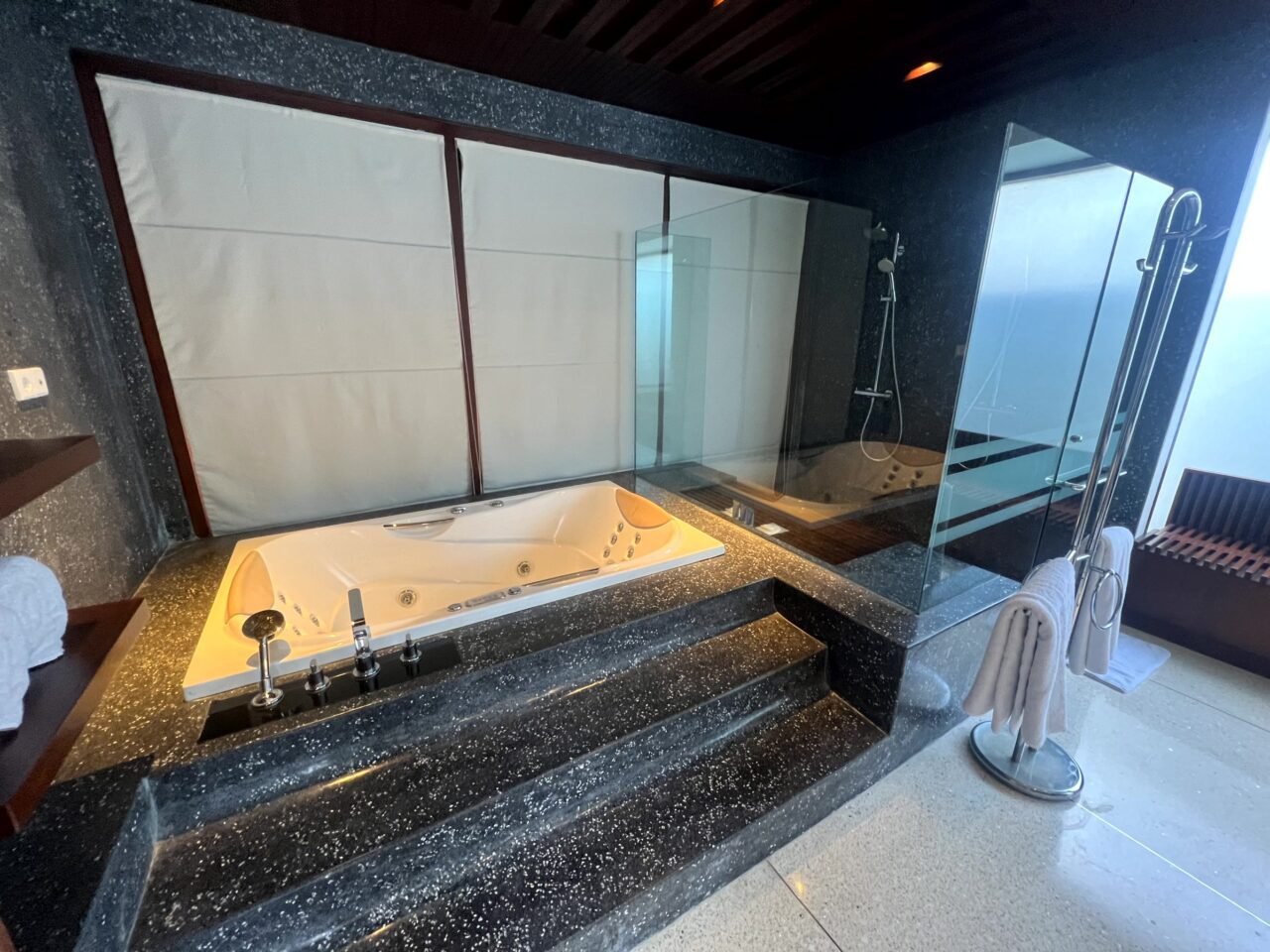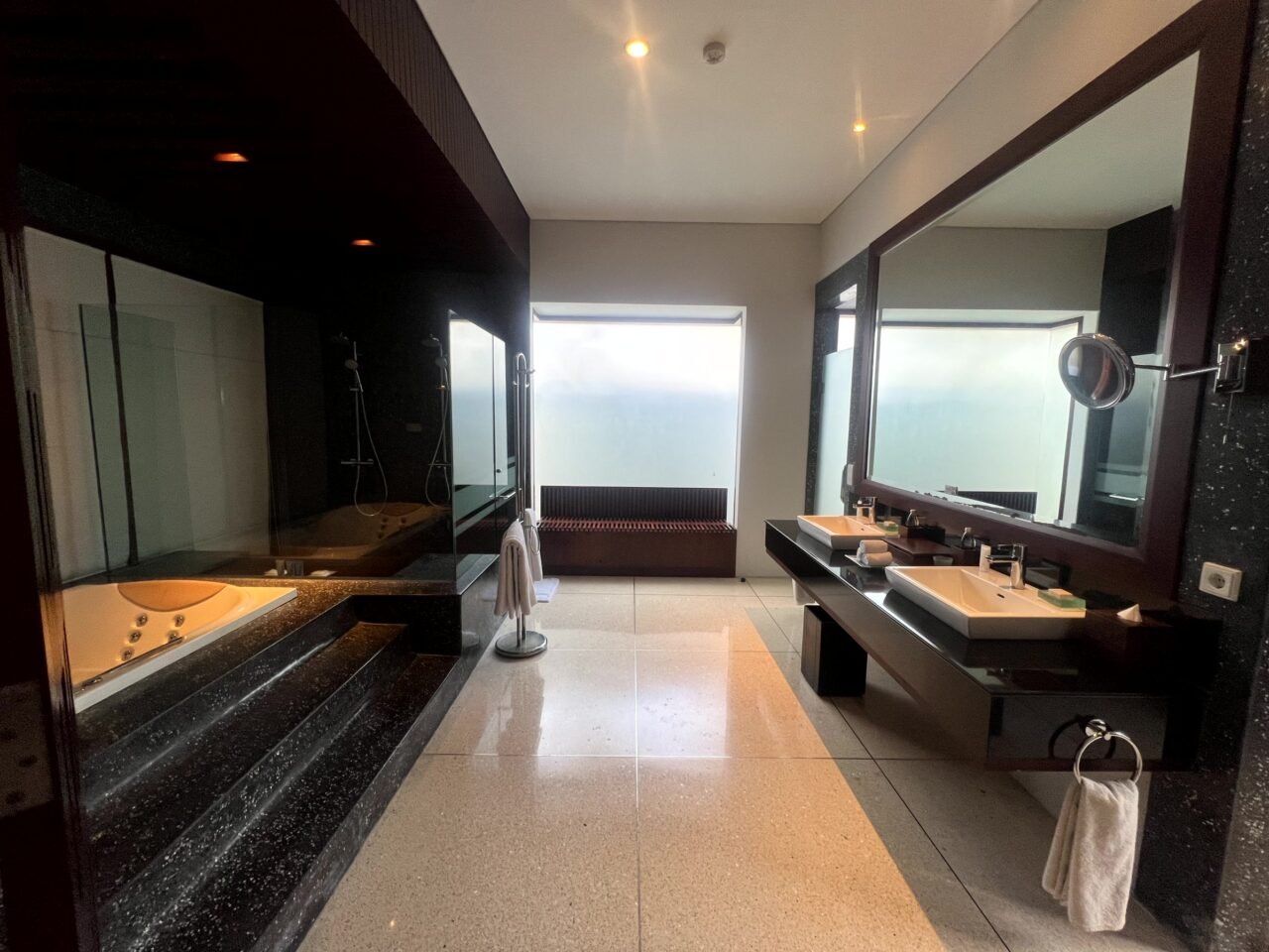 While I had high expectations for this property, it was one of the few times I was genuinely awed by a bathroom. Departing from the light color scheme of the bedroom/lounge, this space embraces dark accents with generous use of marble and wood, evoking the ambiance of a Japanese onsen.