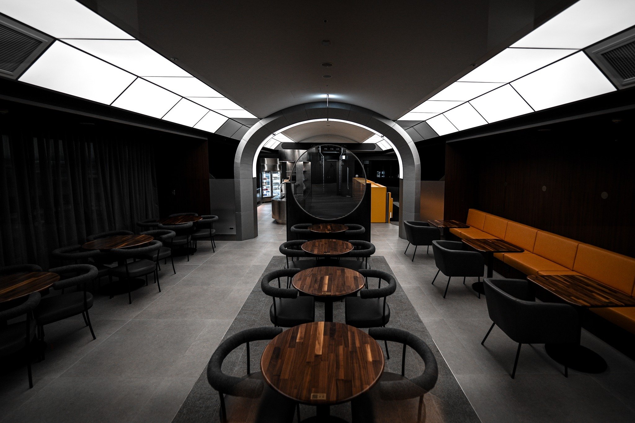 However, in the primary dining and relaxation areas, the design takes an interesting turn, resembling a blend of an upmarket bar, Cathay Pacific lounges, and the interior of a shipping container. Opinions may vary on the uniqueness of this design choice.