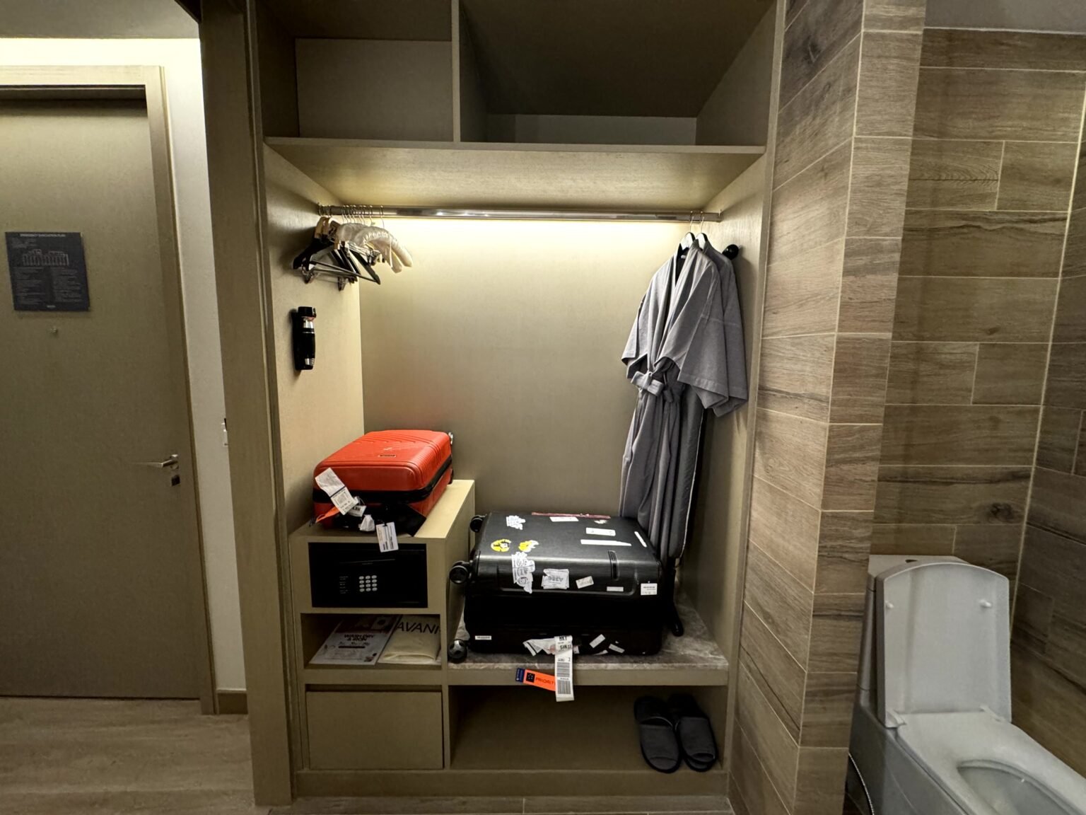 Practical features like an open-plan wardrobe, complete with an ironing board and iron (though more hangers would be appreciated), add to the room’s convenience.