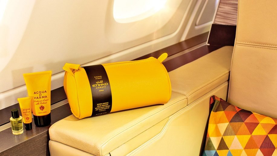 Acqua Di Parma has been the amenity kit partner for Etihad Airways since August 2018. Pandemic withstanding, that’s a long time for amenity kit partnerships – although it came in several iterations during that period. Here’s a shot of the a kit from Acqua Di Parma: