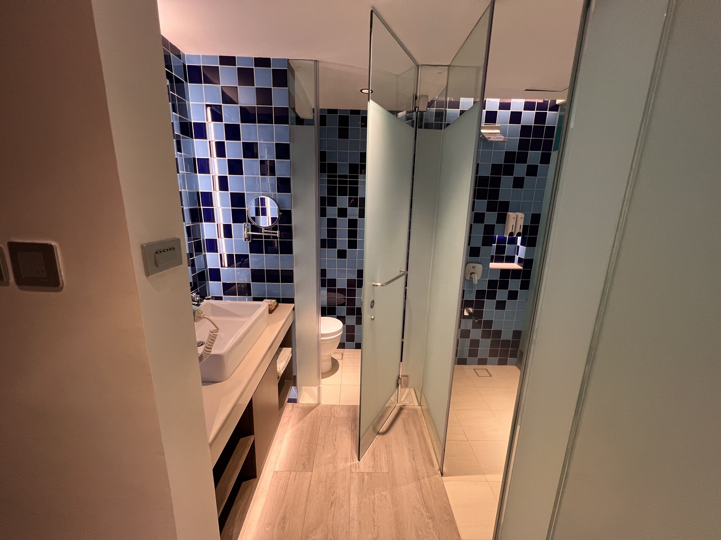 A large bathroom with separated enclosed toilet and shower areas is found near the entrance to the room. The design isn’t to my taste and looks pretty dated considering how new this hotel is.