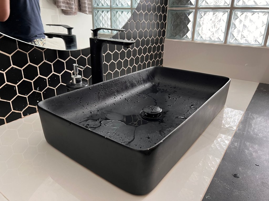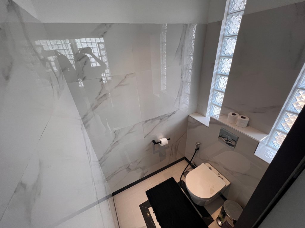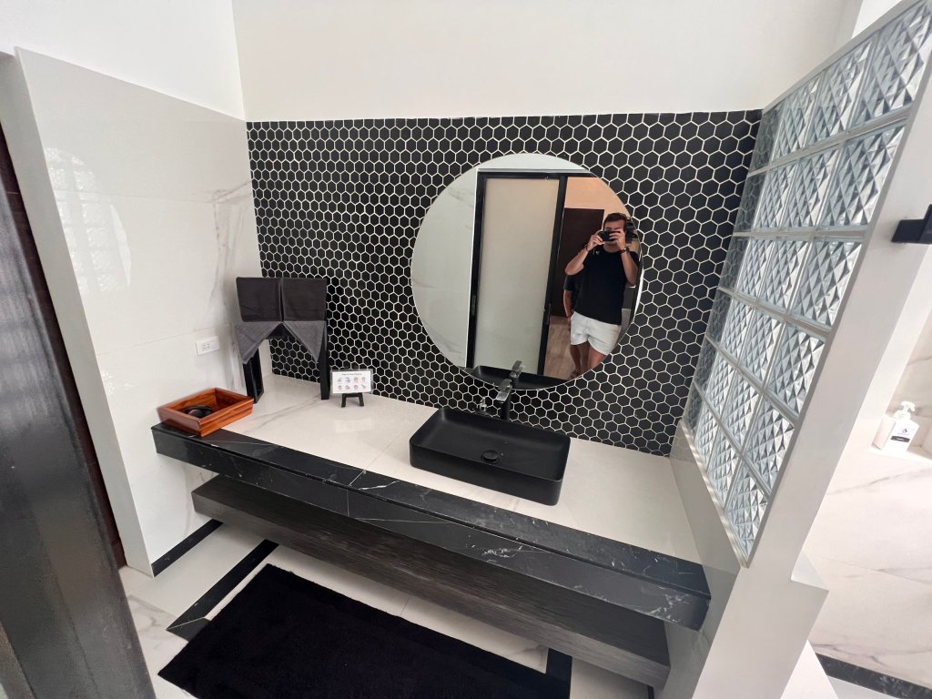 Separated by a sliding door is the stylish and large bathroom. With frosted glass cubes on one side, the space felt open while the shower had excellent pressure and heat – an excellent job from the hotel.