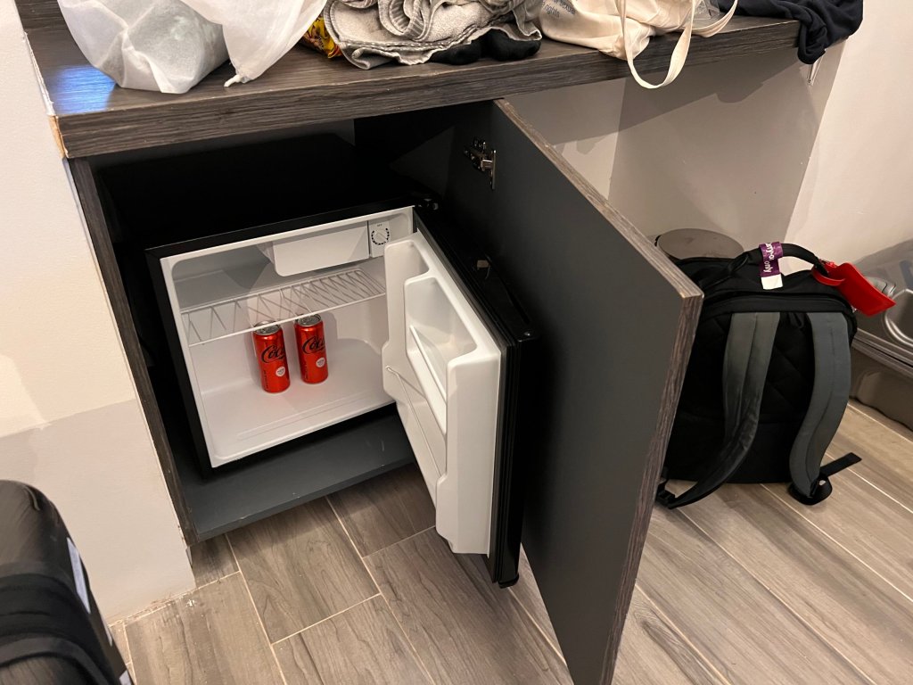 Opposite is a large corner sofa that was cleverly designed but the position of the back rest meant it wasn’t a suitable place to relax. There’s a small refrigerator in this half of the room.